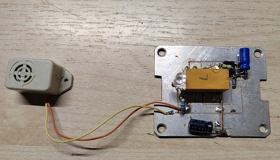 Типы и номиналы большинства элементов есть на принципиальной схеме. Транзистор - любой N-канальный mosfet. У меня 60T03H, выдранный со старой материнки, реле - с двумя группами контактов на переключение с напряжением срабатывания 8v. Остальное некритично. Возможно применение реле и на другое напряжение, при этом номиналы резисторов придётся подбирать. Схема собрана на куске подходящего стеклотекстолита, дорожки сформированы резаком. Схему и зуммер можно закрепить на отрезке металлического уголка и вбить его в землю. Можно положить в герметичную коробку и слегка прикопать.