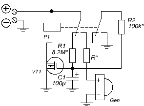 Питание на зуммер подается при помощи простейшей схемы на реле. При подаче питания на начинает заряжаться конденсатор С1 через резистор R1. По достижении некоторого определённого напряжения, открывается VT1 и срабатывает реле P1. Питание снимается с R1 и подаётся на зуммер, одновременно С1 начинает разряжаться через R2, формируя длительность звучания.
